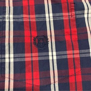 Vibrant red, white, and blue plaid pattern, perfect for summer BBQs. Its classic button-down design and comfortable fit make it a versatile addition to any wardrobe.