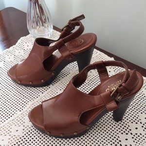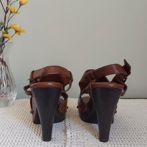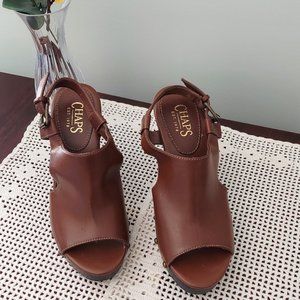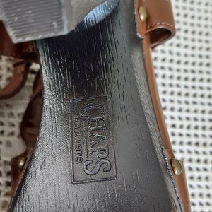 These Chaps Sarista Brown Vegan Leather Peep Toe Heels are in Excellent Condition / Like New - no scuffs, marks, stains, etc. Adjustable Buckle Closure with Elastic Band for added flexibility, Gold Tone Stud Accents, Wood Grain Texture/Appearance on Heel & Platform, and the Soles have a Textured "Non-Slip" Surface. Size - 6B. Approx. Measurements: 4.75" - Heel, 1" - Platform, and 3-3.25" - widest point (ball of sandal). Don't Miss Out on these Amazing Chaps Sandals!!! ***Remember to Bundle & Save***