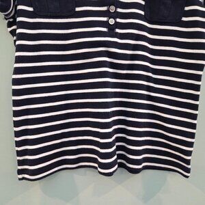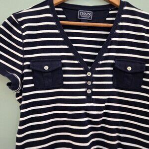 THIS FUN CHAPS T-SHIRT IS NAVY AND WHITE STRIPED AND IS A GREAT ADDITION TO YOUR SPRING/SUMMER WARDROBE. WOULD LOOK GREAT WITH JEANS, WHITE SHORTS OR A FUN SKIRT OR SKORT. VERY SPORT AND COMFORTABLE, MADE OF 100% COTTON. HAS CUTE POCKET AND BUTTON DETAIL.
