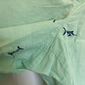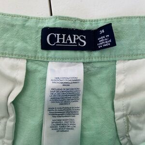 Men’s CHAPS shorts. Shorts are a mint green khaki material with dark blue fish pattern. Flat front style. In good condition, but does have a very very slight marking as shown on the right back pocket. Size 34 smoke free home!