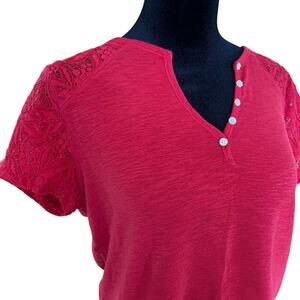 CHAPS women’s cotton top with short lace sleeves. Buttons in V neck.
