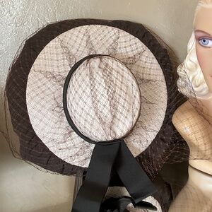 This is a sensationally beautiful natural straw hat from the early 1940s'! The crown is short, oval and flat at the top, and is surrounded by a wide brim which is edged in a brown grosgrain band. There is a darker brown band around the crown which ends in a bow at the back. The hat is entirely covered with beautiful brown veiling. There is a grosgrain and elastic "o" ring band attached to the inside of the hat to keep it in a. tilted position.
