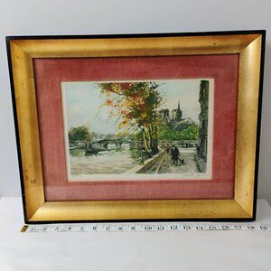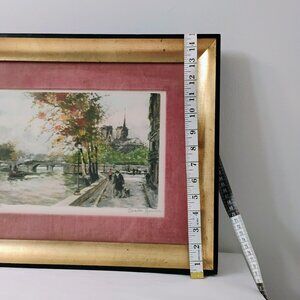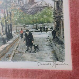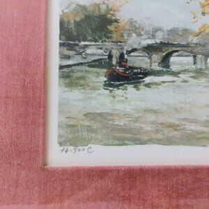This vintage signed, LOW NUMBER limited edition print by Charles Blondin captures a picturesque Parisian street scene with a charming autumnal ambiance. The artwork is beautifully framed with a golden border, offering a touch of elegance to the nostalgic depiction of life by the Seine River. A perfect piece for admirers of classic European impressionist art.