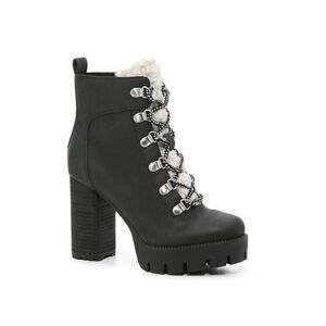 Boost chilly weather looks with the Weary boot from Charles by Charles David. This standout ankle boot has contrasting faux-fur trim accented design that brings a cozy touch while the speedy D-ring lacing, dramatic heel and platform add dynamic appeal.