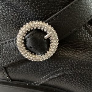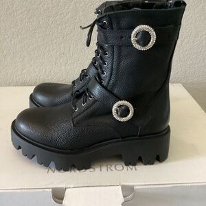 Sparkling buckles add a flash of sophistication to the utilitarian profile of this lug-sole bootie. No original box. 2 1/4" heel; 1 1/2" platform 7 1/2" shaft Leather upper/synthetic lining/rubber sole Made in Italy
