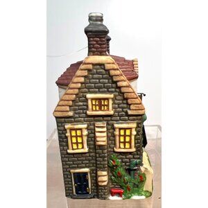 This detailed porcelain building ornament depicts the Dedlock Arms pub from Charles Dickens' literary works, featuring illuminated windows, snow-covered roofs, and intricate architectural details typical of Victorian-era establishments. Org Box