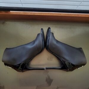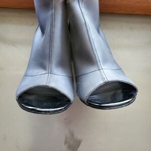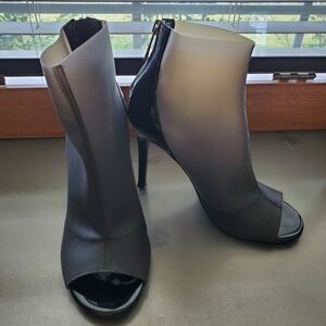 Unique pair of open toe ankle opaque boots. Black jelly cover, lined with black patent leather. Extremely comfortable and stylish!
