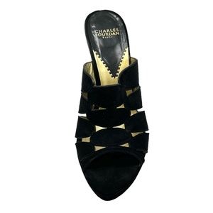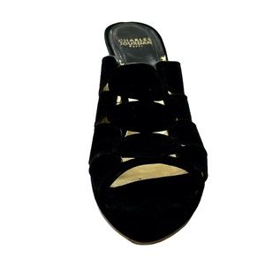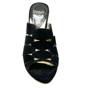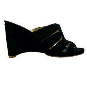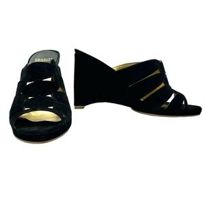 Charles Jourdan Paris black suede wedge sandal/slide size 8 1/2M in good preowned condition. Brass/gold trim with “CJ” on the heel. Unusual design of open ovals across the front with a peep toe. There is an area of discoloration on the metal on the back of the left shoe. See pictures. The metal runs under the shoe about 1/2 way. Only worn a few times. Heel is approx 4”High and 1/2”Wide