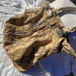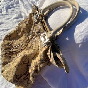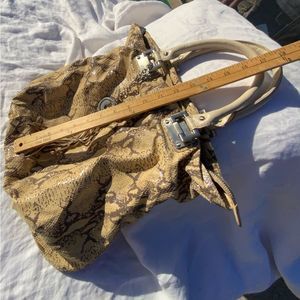 Gorgeous snake skin leather bag. White leather handles. Zip,top. Tassel detail. Satin lining. Gorgeous and in excellent condition.