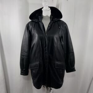 CHARLES KLEIN! CLASSIC BLACK GENUINE LEATHER PARKA STYLE ZIP OFF HOOD COAT! SZ L