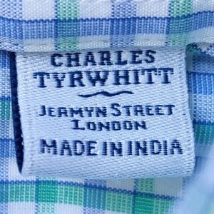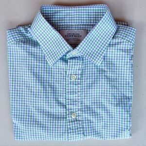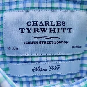 CHARLES TYRWHITT Button Down Shirt 16/33" Slim Check Long Sleeve Green Blue Mens