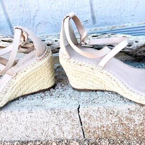 Gently worn, women's wedge espadrilles in light beige and upper creamy pink (very light) in color, size 6, 3 inch wedge, cross-over high adjustable ankle straps, single strap across toe.