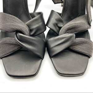 A wrapped stiletto brings leg-lengthening lift to this edgy leather sandal with glinting beaded chains and knotted straps.