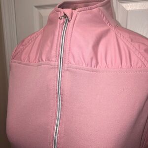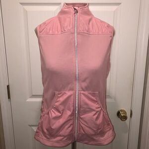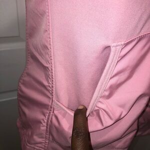 Pink vest with silver zipper, 2 side pockets and inside drawstring for tight fit around waist. Lightweight fabric and sporty look. Length 23in.