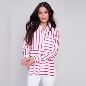 Get ready for spring and summer with this versatile yarn dye striped top for women. It features a button-down front, shirt collar, front pocket, and classic stripe design. Dress it up or down as needed, wear it open or closed, and get this long women’s shirt