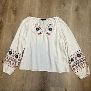 Pretty white blouse with navy and pink floral embroidery and blouson sleeves from Charlie B