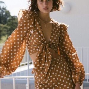 Charlie Holiday's Nyla top comes alive with a playful dot print, flouncy ruffles at each shoulder and a cropped silhouette.
