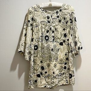 CHARLIE JOE Women’s Beige Abstract Floral Print Shift Dress Bell Sleeves Size Medium. Good pre-owned condition. Gentle signs of wear. All measurements are approximate.