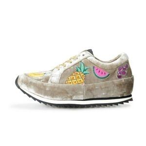 CHARLOTTE OLYMPIA Metallic Gray Velvet Velour Work It Fruit Salad Sneakers with embroidered fruit patches