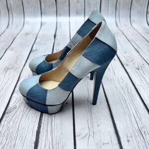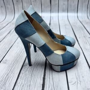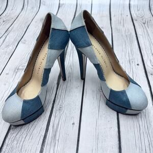 CHARLOTTE OLYMPIA PRISCILLA IN STRIPES BLUE LINEN PLATFORM HEELS SIZE 37 1/2