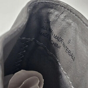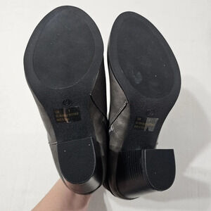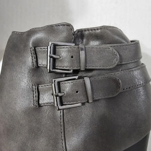 Gray faux leather ankle boots. zip up style with buckle details. Minor damage to the insides, as shown. Worn once.