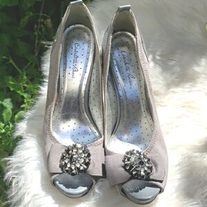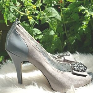 CHARLOTTE RUSSE High Heels Sz 9 Stiletto Pumps Peep Toe Bow Concho Grey