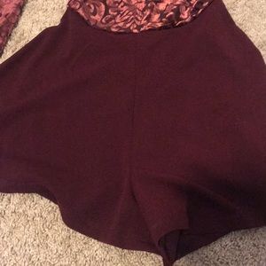 maroon romper with velvet design on the top half with a mock neck, shorts are nice and comfortable too