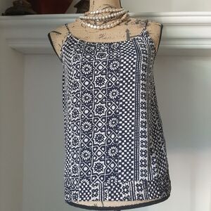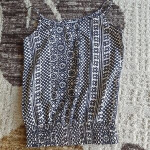 EUC Charlotte Russe sleeveless top. Dark blue on tan background. Gathered waist for blouson styling