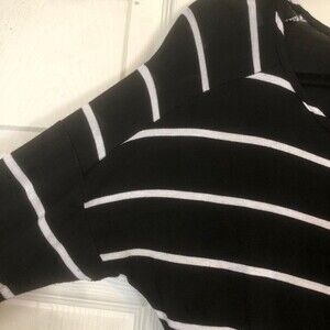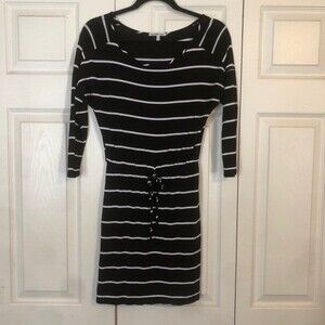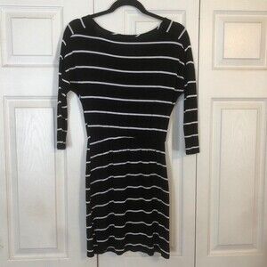 Size x-small Charlotte Russe black and white stripe mini dress with elastic waist with faux tie. Elastic waist flatters shape - the top of the dress can be bloused over the elastic. 3/4 length sleeves.