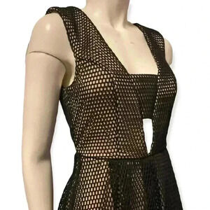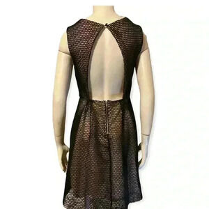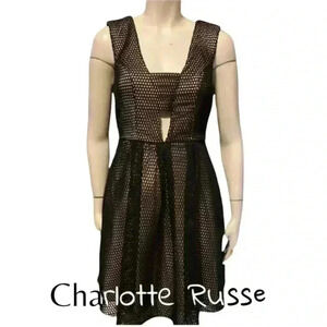 Charlotte Russe Fit-n-flare peek-a-boo cutout bandeau dress. Black poly netting over satiny taupe lining. Open back with single button closing at neckline. Fitted waist with pin-tuck pleating in front; dramatic exposed zipper in back. New condition!