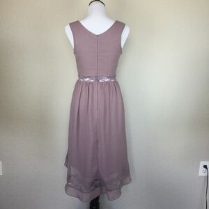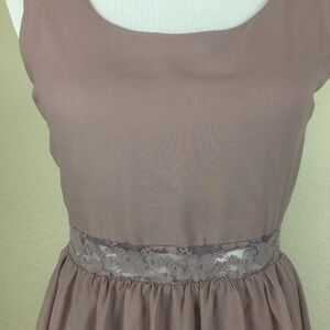 Sleeveless, scoop neckline, has 1.5” see through lace around waist plus lace on bottom above hemline. Hemline is high-low (longer in the back). Zip up back with hook & eye top closure. 100 polyester. Size S, color: plum
