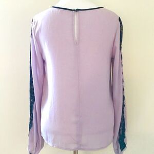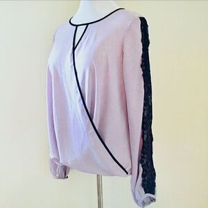 Charlotte Russe Light & Silky Lilac Blouse with Black Lace Embellished Sleeves & Black Trim - Size L