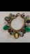 Our Lady of Guadalupe Cameo charm bracelet. The cameo in the center is aWedgwood green background with a cream colored Guadalupe. The bracelet consists of mixed metals, brass and silver. There are Guadalupe’s charms in brass and silver alloy. There are two vintage 70s jade green resin flower, Smaller purple cameos resin flowers and Purple lady cameos set in brass bezels.