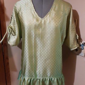 CHARMEUSE Boho Ruffled Blouse XL Mint green Gold Silky print Sexy V-neck Tie sle