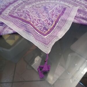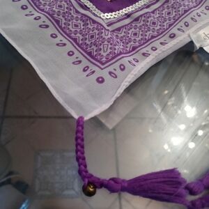 CHARMING CHARLIE'S BEAUTIFUL PURPLE AND WHOTE FLORAL AND AZTEC PRINT FASHION SCARF WITH PURPLE TASSELS AT EACH CORNER WITH BRASS BEAD ACCENTS SCARFE HAS GOLDEN AND SILVER SEQUINS AT TWO CORNERS AND MIDDLE..NO NOTED FLAWS