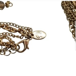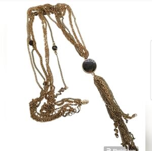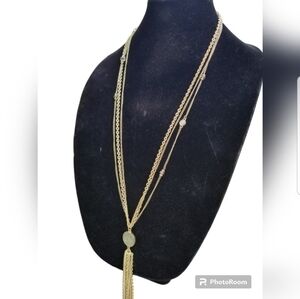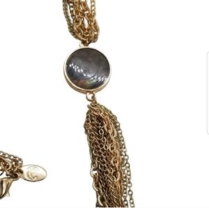 Lovely necklace by Charming Charlie is made of goldtoned steel with three chain design. Necklace has large goldtoned tassel pendant with irridescent mother of pearl like design. Necklace has faceted glass beads along chain. Necklace measures 32" in length with a 3" extender chain. Like new condition.