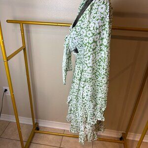 RUFFLE HEM FLORAL NECK LONG SLEEVE DRESS