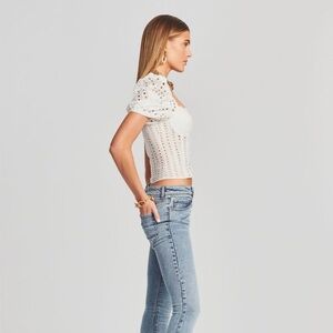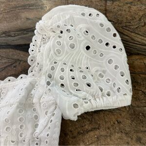 The Ella top—isn't it romantic? Featuring a corset-like structure, dreamy balconette neckline and puffed sleeves, this style is made from a broderie anglaise cotton blend. The Ella top cinches in at the waist thanks to its side zipper and shirred back, creating an incredibly flattering silhouette. Shown here in White.