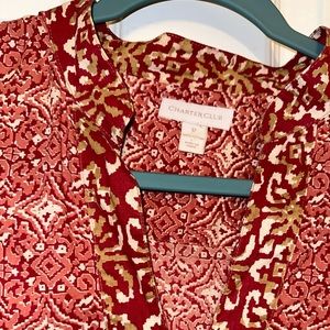 Add a pop of color to your wardrobe with this Charter Club sleeveless top. The orange cotton print with an abstract pattern is perfect for a casual occasion. The V-neck and pullover closure add a touch of style to this regular fit blouse.