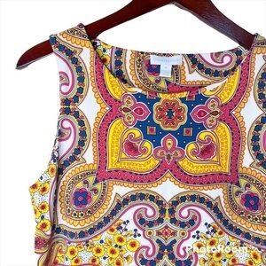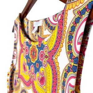 Soft Jersey Knit Shift Dress from Charter Club. This is a great, versatile Dress offering a sleeveless, pull on styling. Effortless lightweight knit with a smooth texture finish. All over brightly printed geometrical print in Yellow Gold, Pink, Blue and White. Nylon and Spandex blend with a slim and flattering fit. Woman’s Size Medium