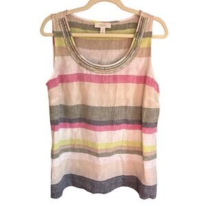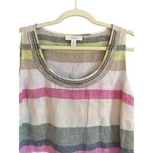 Charter Club Sz M Luxury Linen Sleeveless Top Striped Decorative Neckline Neutral Colors | NWT