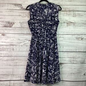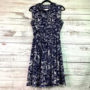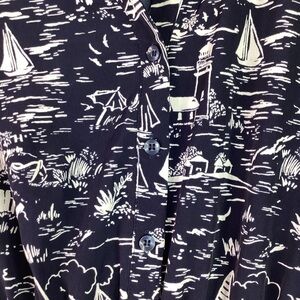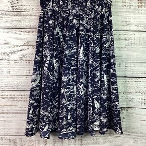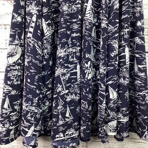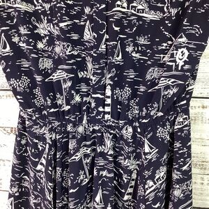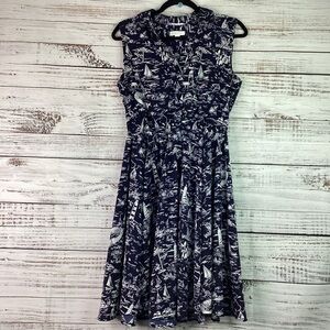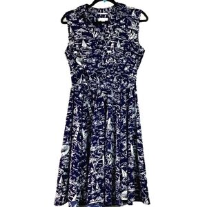 Charter Club Brand, Size 10 petite, called the scenic dress for a reason, navy blue colors with nautical beach scenic prints, sleeveless, V neckline, flattering A line dress is made from a perfect for summer print, pullover styling with button closures, polyester, excellent pre owned condition.