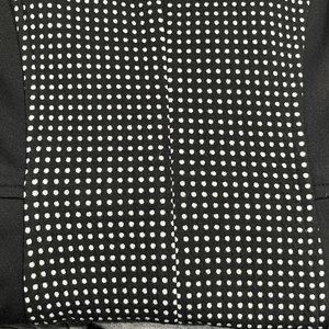 This dress is preloved, used a few times and in excellent condition. Sleeveless slim fitting dress, has some weight to it, with a 2-tone design. Black to the outer sides with a white polka dot to all remaining areas. Black piping around the neck. A left side zipper allows for getting in and out of dress. Pairs well with cardigans, heels, boots or flats.