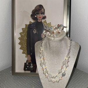 Beautiful, Simple and Classy Statement Necklace with matching two strand Stretch Bracelet. Iridescent with light pink accent