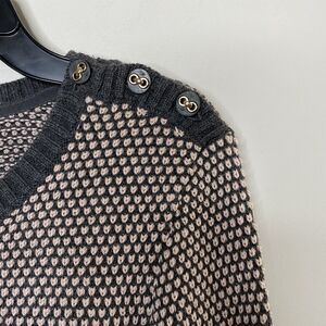 Gray, pink metallic pullover sweater with decorative 3 buttons on left shoulder