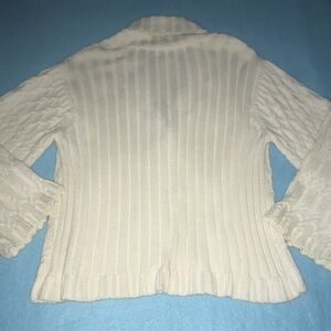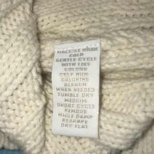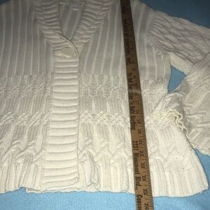 Charter Club chunky knit sweater with single large button closure cream colored, loose bell type sleeves. I have a matching hat and gloves in my closet too. Beautiful pattern!