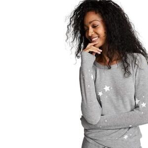 CHASER Stars Light Gray Crew Neck Pullover Size Large. Chaser brand light heather gray pullover sweatshirt with white stars pattern. Super soft and cozy. Size Large. Excellent Used Condition. 49% polyester/46% rayon/5% spandex.