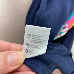 Retro inspired graphic print band tee with 60s style colors and peace signs. Intentional light distressing to screen print to give it a vintage feel. Soft 100% cotton knit short sleeve style with crew neck in solid navy blue.