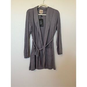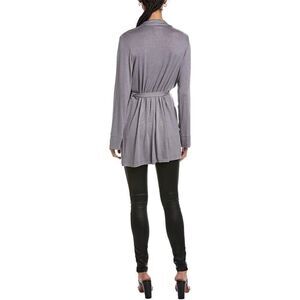 About the brand: Continually experimenting with fabrics and dyes for that rugged Rock-N-Roll feel. Steel glitter wrap kimono with shawl collar, two front pockets and tie waist band approximately 33 inches from shoulder to hem. Model is 5'12" and wearing a size Xs/S. Measurements may vary slightly depending on size. Open front, 95% viscose, 5% elastane, machine washable