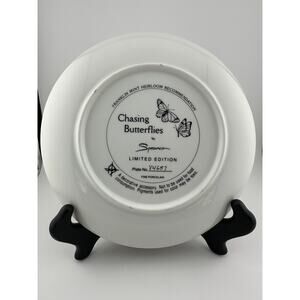 The "Chasing Butterflies" plate by artist Sprovach from The Franklin Mint features an 8-inch round porcelain collector plate with a multicolor kitten and butterflies pattern. The plate is part of the Franklin Mint Heirloom franchise and has a decorative style with gilt edges. Produced in the late 20th century, this vintage piece is a charming addition to any collector's display, showcasing the theme of butterflies in a whimsical and artistic manner. Made in China, this beautifully crafted plate captures a unique blend of American culture and artistic pottery techniques. NOT FOR FOOD USE, DECOR ONLY!